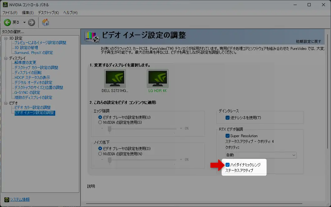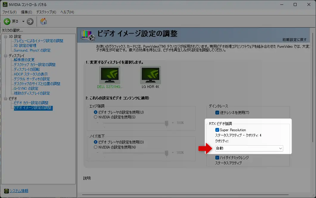 これまでは、クオリティ設定が1~4を選択できましたが、新しく自動を選択できるようになりました。ステータス表示も追加されています。ステータスは有効無効という意味ではなく、動作時にアクティブになる。この動画はVSRが動いているのかな?と確認したい時にはNvidiaコントロールパネルを確認すると良いでしょう。