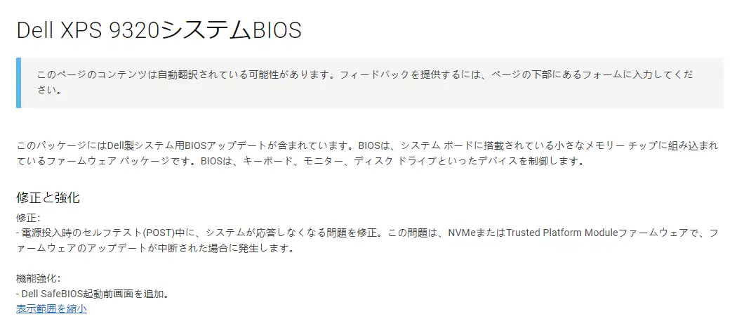 もしダウングレードをして表示を消したい時には以下の方法でBIOSについて確認ができます。XPS 9320のケースで説明します。