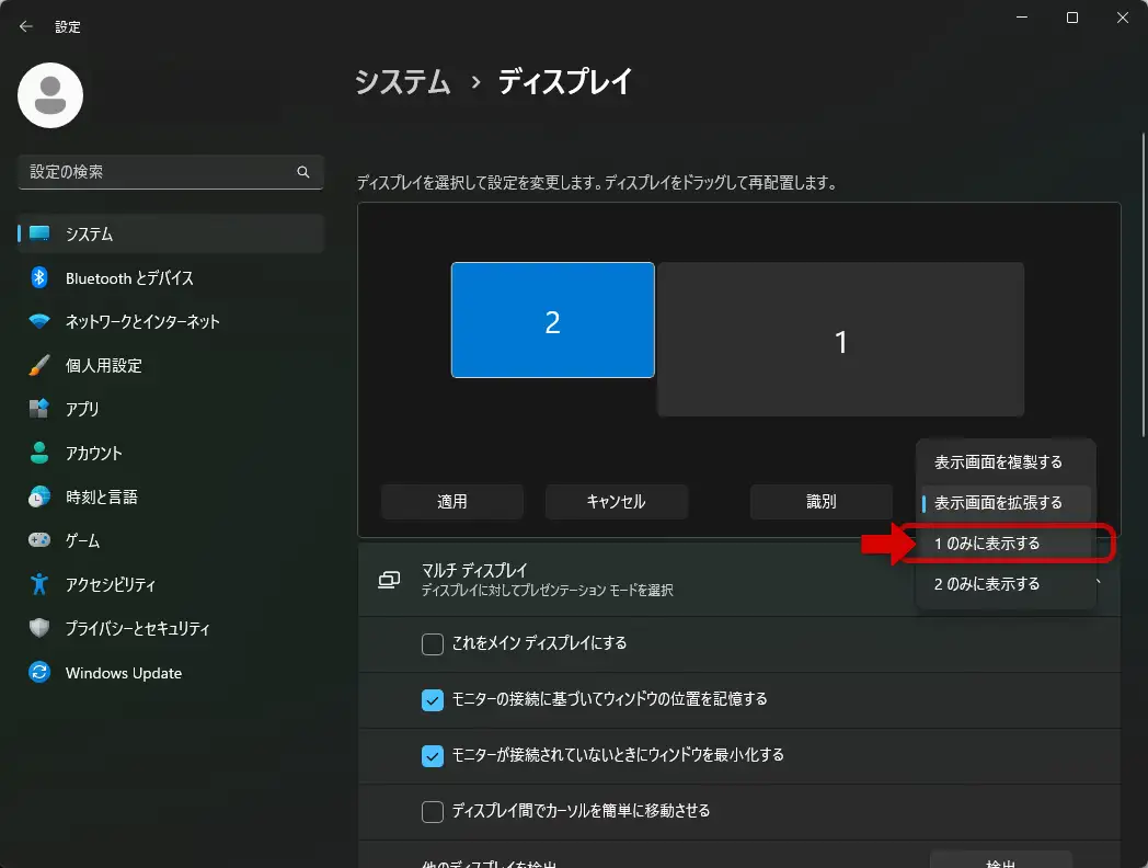 内蔵ディスプレイが2番、外部ディスプレイが1番になっている場合の例です。
