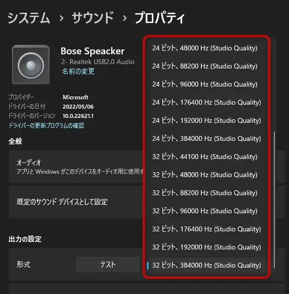 この設定はオーディオ出力の品質を変更できます。例えば、ハイレゾなどの音質を再生する場合、この設定で出力がハイレゾに合った設定になっている事でスピーカーやヘッドフォンで高音質で聴くことが出来ます。自作PCなどでは高音質なDACを搭載している場合もありますので設定をして高音質で聴くと良いでしょう。設定方法は次の通りです。
