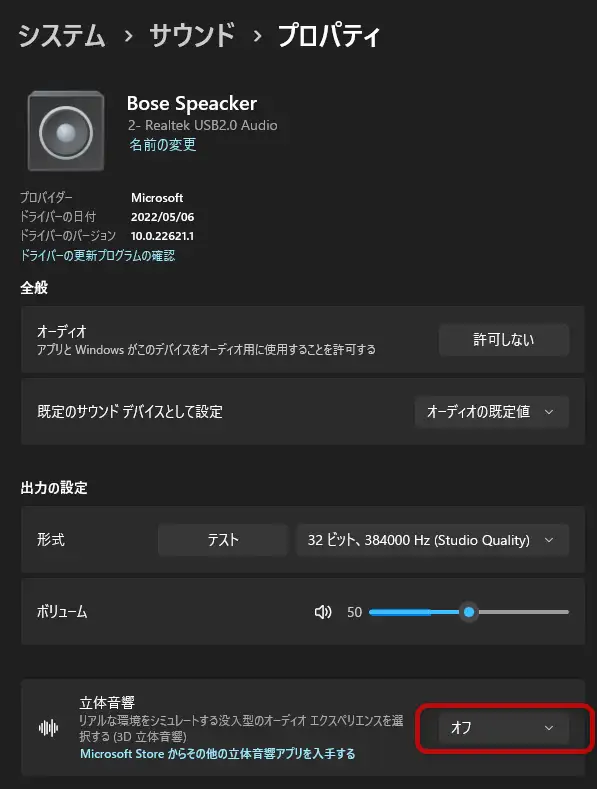 オーディオの強化(デバイスの既定の効果オンオフ)