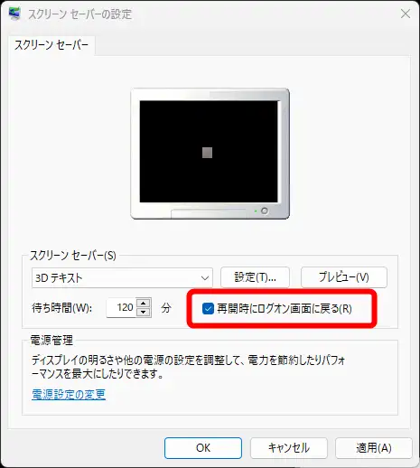 組織などでは、離席などで5分程度経過するとこのスクリーンセーバーの「再開時にログオン画面に戻る」の機能を使って画面ロックする設定になっているケースが多くあります。特に日本の企業では。組織によりますが、この「再開時にログオン画面に戻る」という設定を変更不可能にしている事があります。この場合は裏技ですが、PowerToys Awake で画面ロックを回避する という方法もあります。