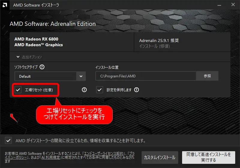 インストーラーでインストールする時、追加オプションを開くと工場リセットにチェックが出来ます。このチェックを付けてインストールする事で、クリーンインストールする事ができます。方法1、方法2は異なる箇所の修正がされるため、インストーラーの失敗は破損の場合、方法1だけで直る事も良くあります。