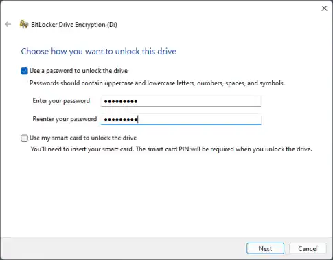 “このドライブのロック解除方法を選択する” – “パスワードを使用してドライブのロックを解除する “を選択し、画面に表示された条件を満たすパスワードを設定します。