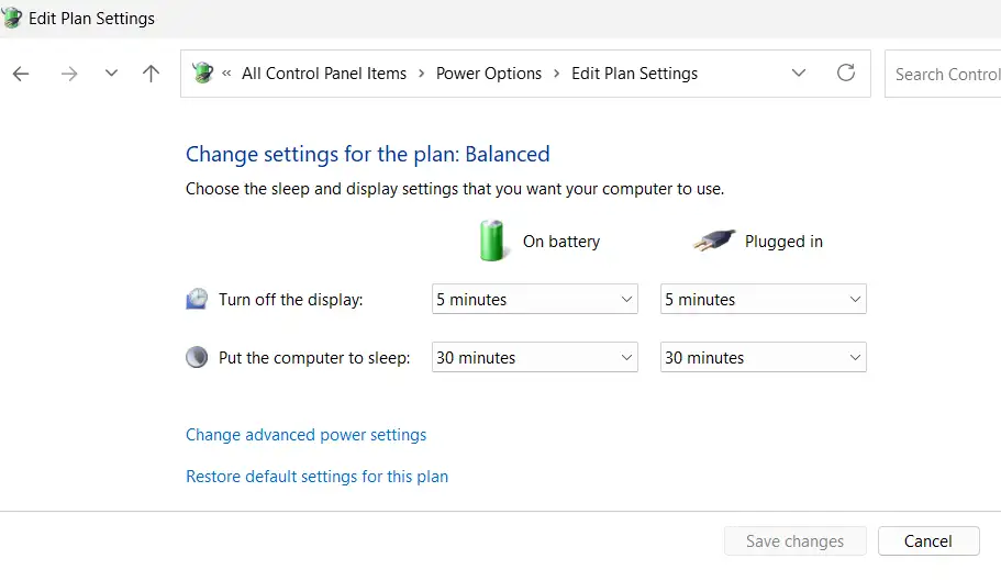 You can find power-related settings in both the Settings app (modern UI) and the Control Panel; they are linked, so changing either is fine.