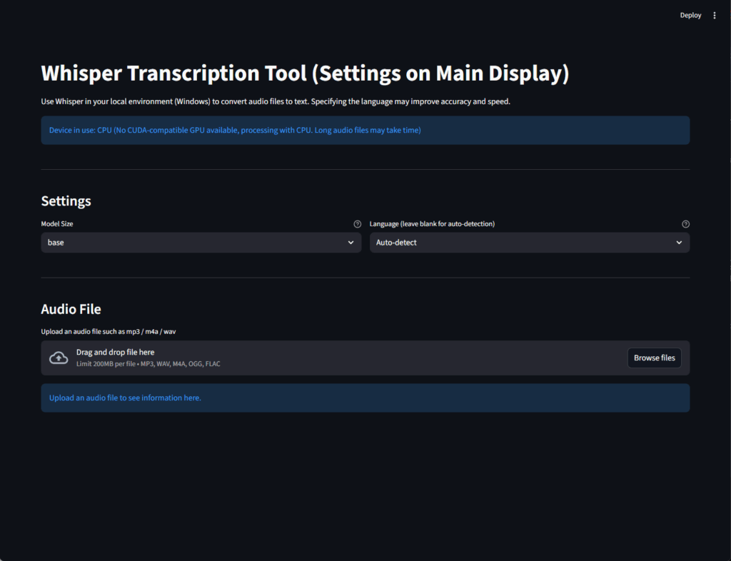 Whisper Transcription Web App (Streamlit・Windows・Settings displayed on main screen)