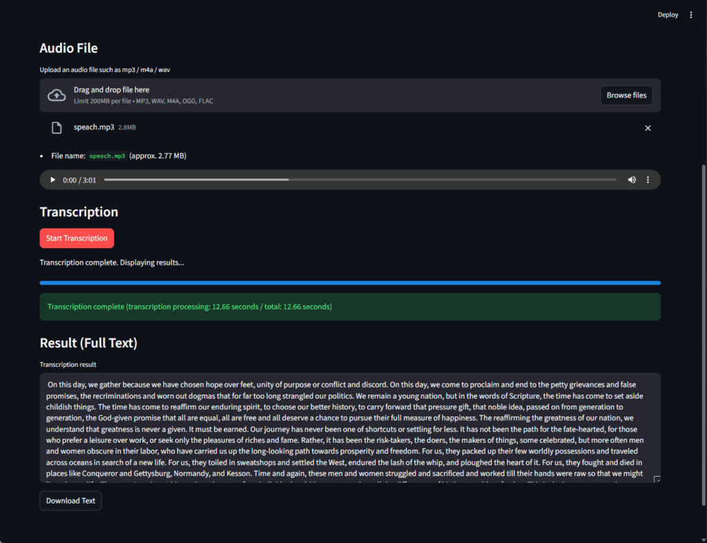 Click Browse Files, select the corresponding audio file, and run Start Transcription to verify the operation.