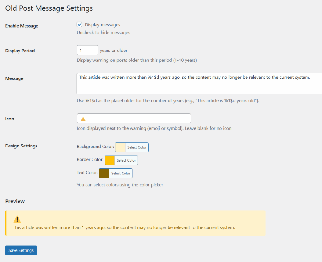 This plugin displays a message at the top of all posts older than a specified number of years. The primary purpose is that technical articles over a year old may contain outdated information unsuitable for the systems being viewed. Due to its simple functionality, it may be adaptable for other uses with icon or design modifications.