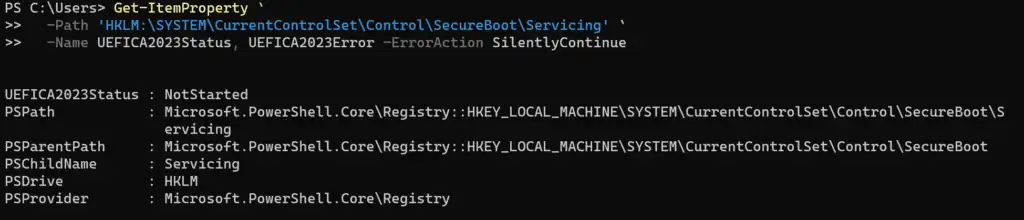 Get-ItemProperty -Path 'HKLM:\SYSTEM\CurrentControlSet\Control\SecureBoot\Servicing' -Name UEFICA2023Status, UEFICA2023Error -ErrorAction SilentlyContinue次の結果でステータスは目的のサービスがスタート出来ていない状態だと分かりました。