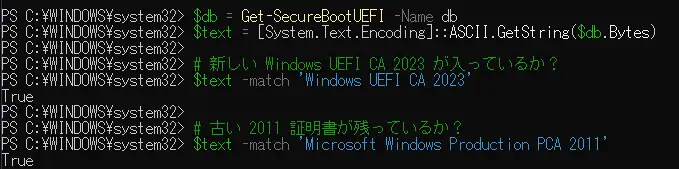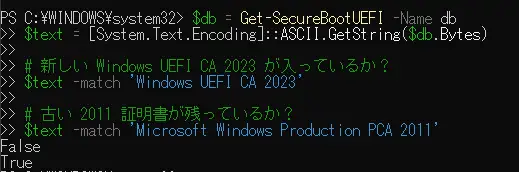 $text -match 'Microsoft Windows Production PCA 2011'実行した結果は次のような内容でした。古い2011証明書はTrueでしたが、目的の2023証明書はFalseになっていた。