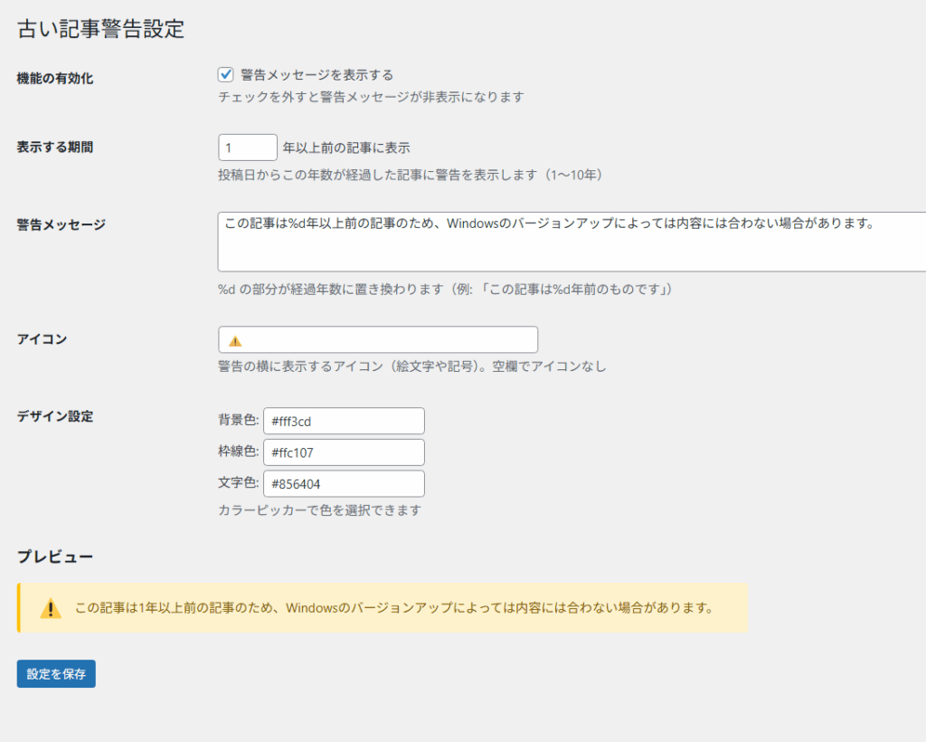 このプラグインは、投稿ページ全てを対象に、指定した年数以前の投稿の冒頭にメッセージを表示します。