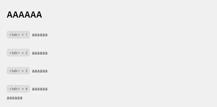 プレビュー画面では入力を可視化する為に <tab> x 1 という表示がされますが、公開画面にはインデントのみ反映します。