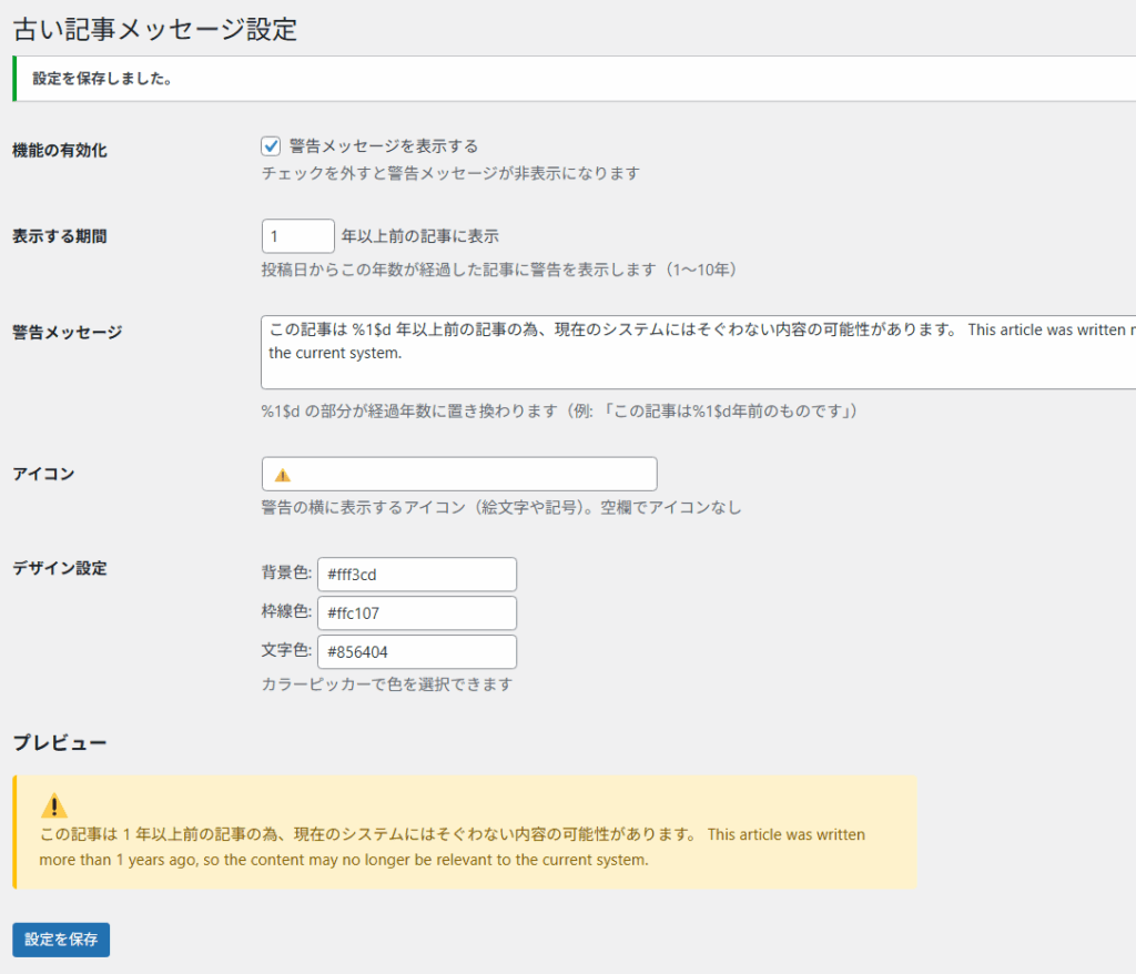 このプラグインは、投稿ページ全てを対象に、指定した年数以前の投稿の冒頭にメッセージを表示します。