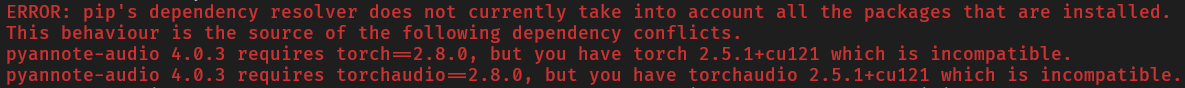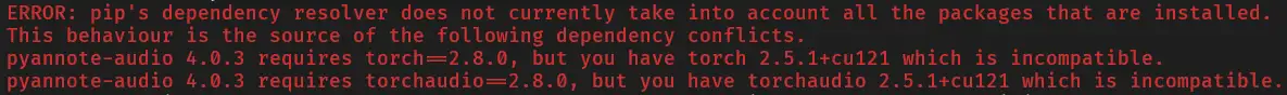 pyannote.audio==4.0.3requirements.txt内で指定したPythonライブラリをvenvへインストールする。
