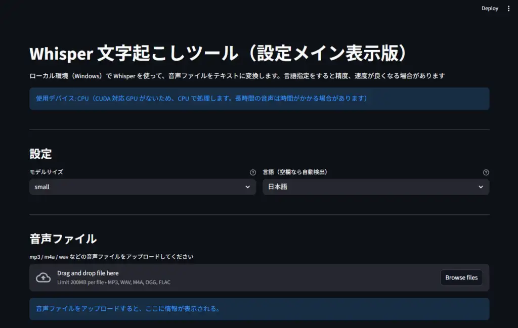 Whisper 文字起こし Web アプリ(Streamlit・Windows 向け・設定をメイン画面に表示)