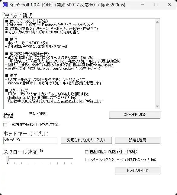 まるで、某社の丸いトラックパッドのように、くるくるジェスチャーをするとスクロールできるジャスチャーアプリです。使い方はアプリにも表示されます。
